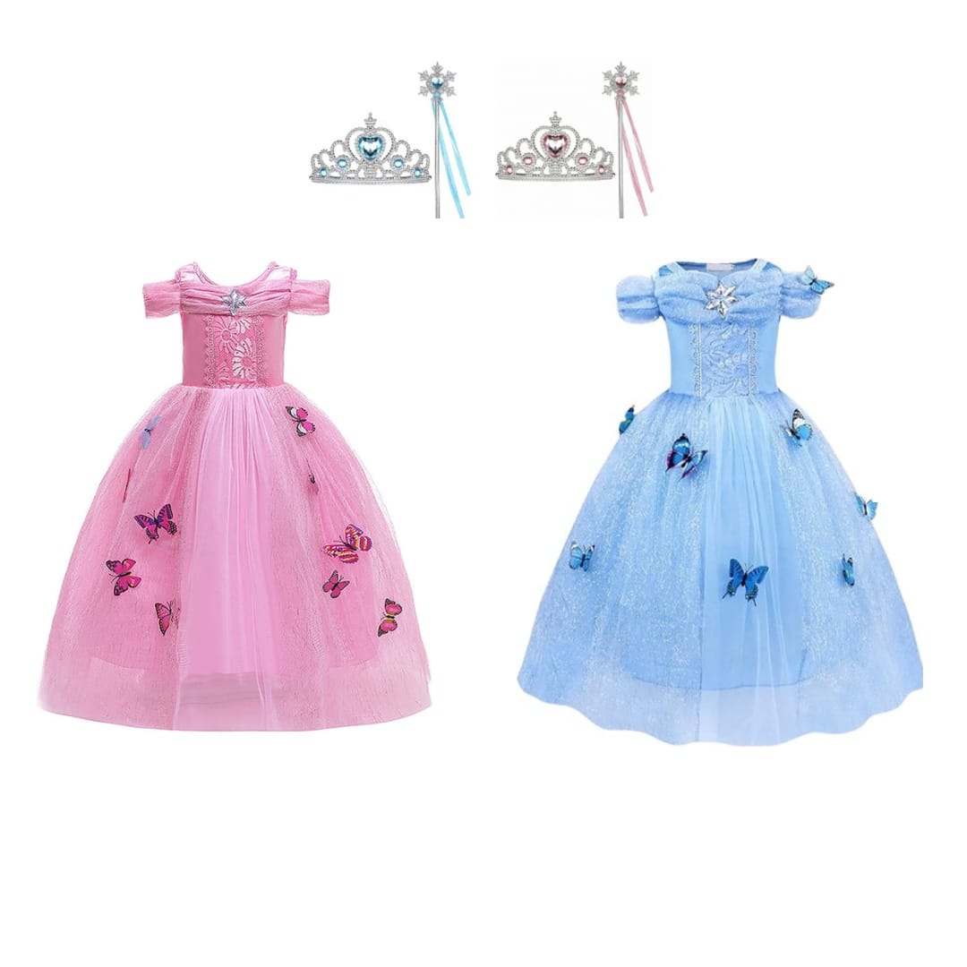 Deze sprookjesachtige jurken in roze en blauw zijn een echte droom voor elk meisje dat van verkleden houdt. De jurken zijn versierd met mooie vlinders die met speldjes kunnen worden vastgemaakt, zodat je kind haar outfit helemaal naar eigen smaak kan maken. De zachte tule en zorgvuldige afwerking geven de jurken een magisch en speels effect – ideaal voor elk fantasierijk moment.