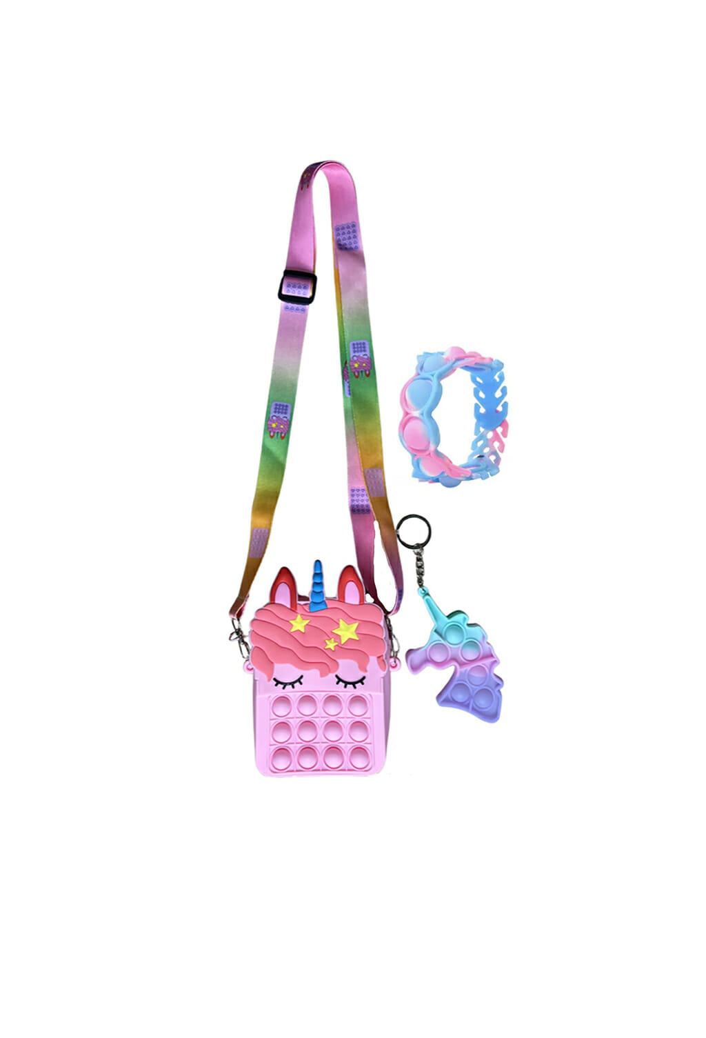 Het Pop It pakket betaat uit een roze Unicorn tasjeUnicorn Hanger en een Armband.