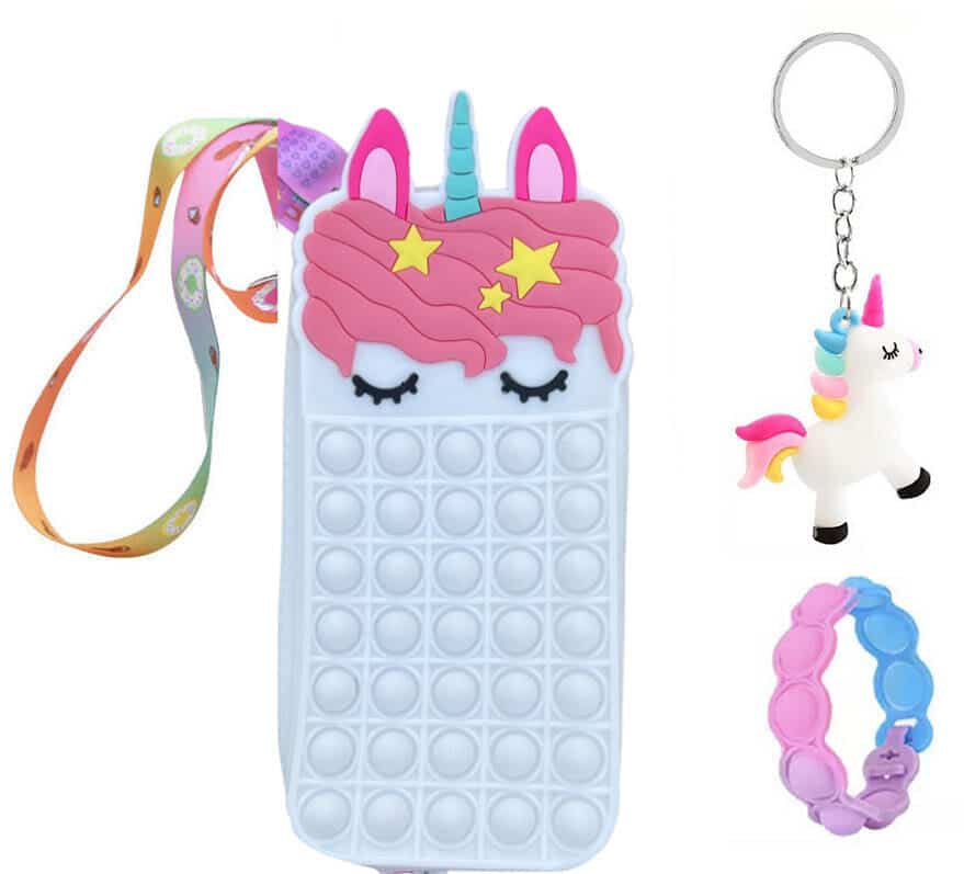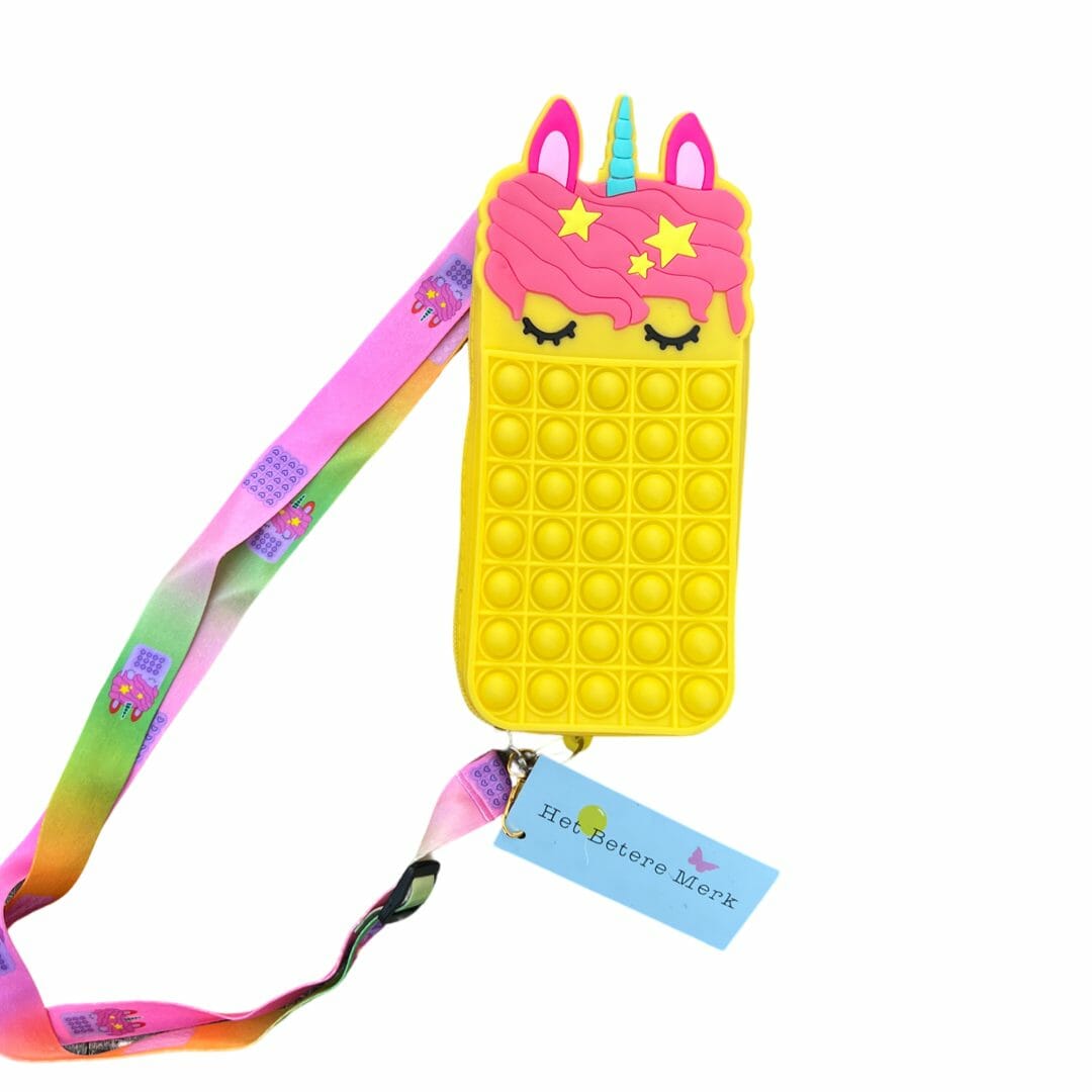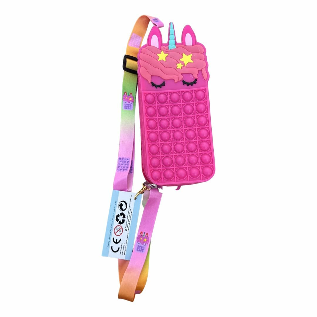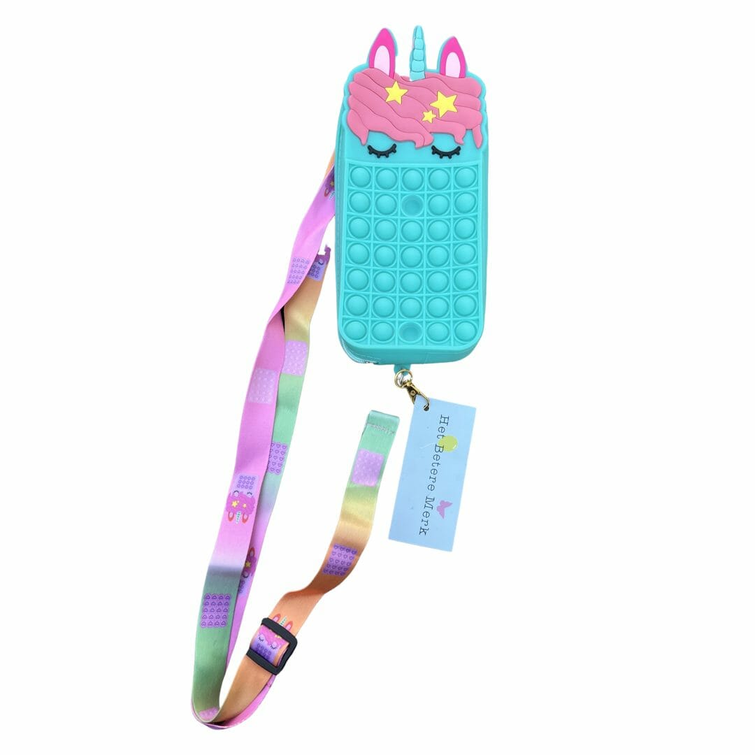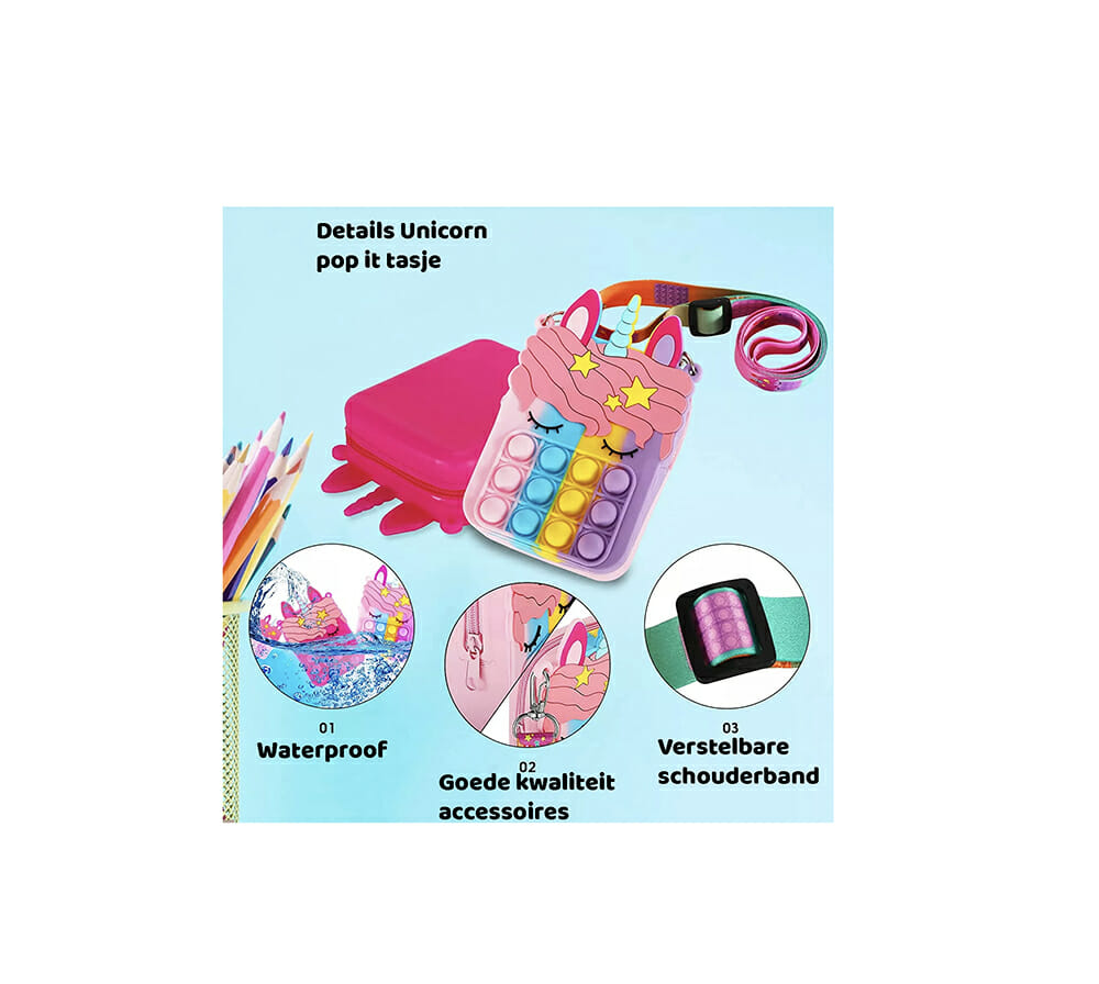 Het Pop It pakket betaat uit een multi gekleurd Unicorn tasjeUnicorn Hanger en een Armband.