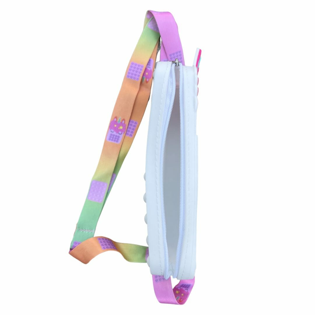 Door de gekleurde verstelbare draagband kun je het Unicorn tasje op verschillende lengtes dragen.