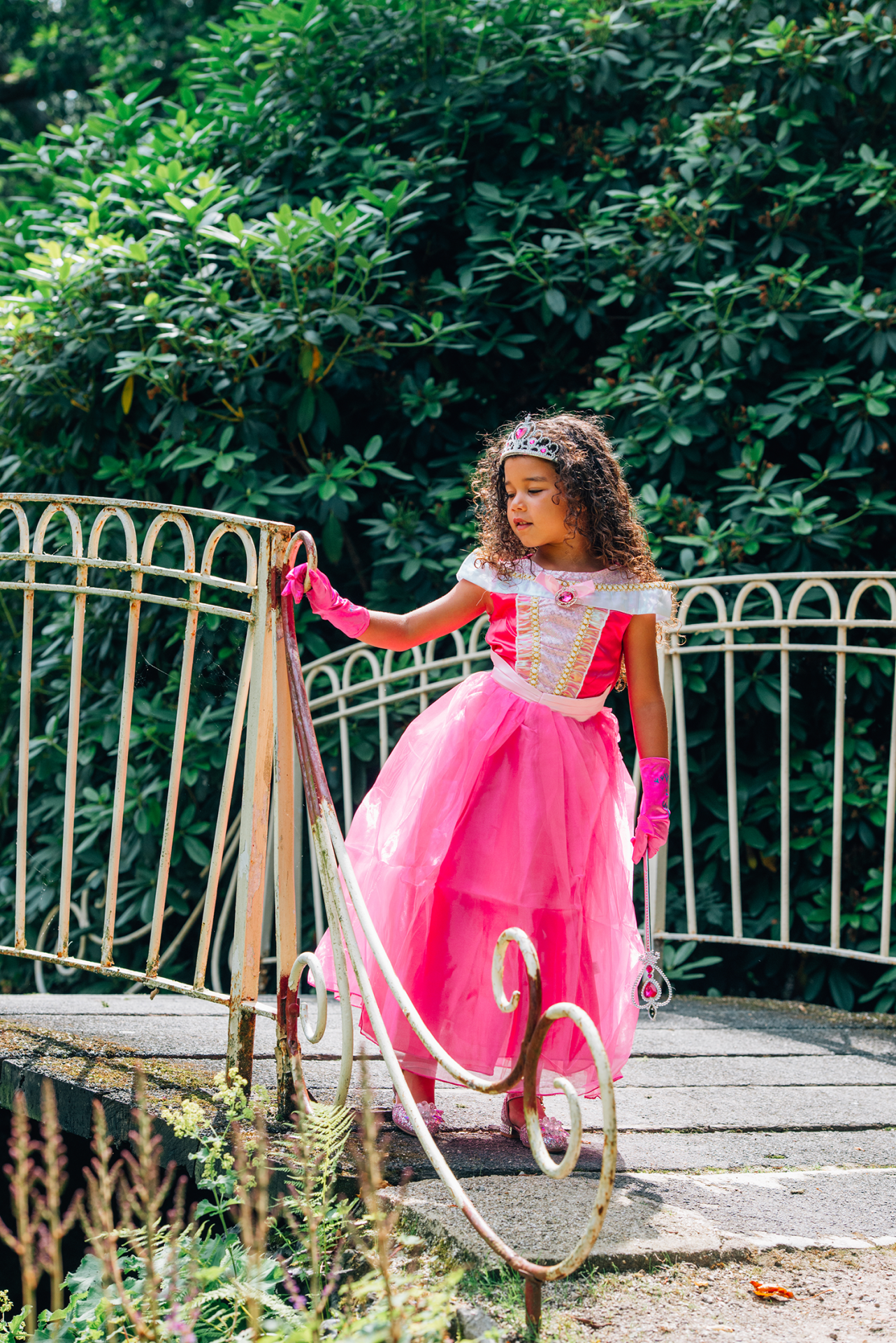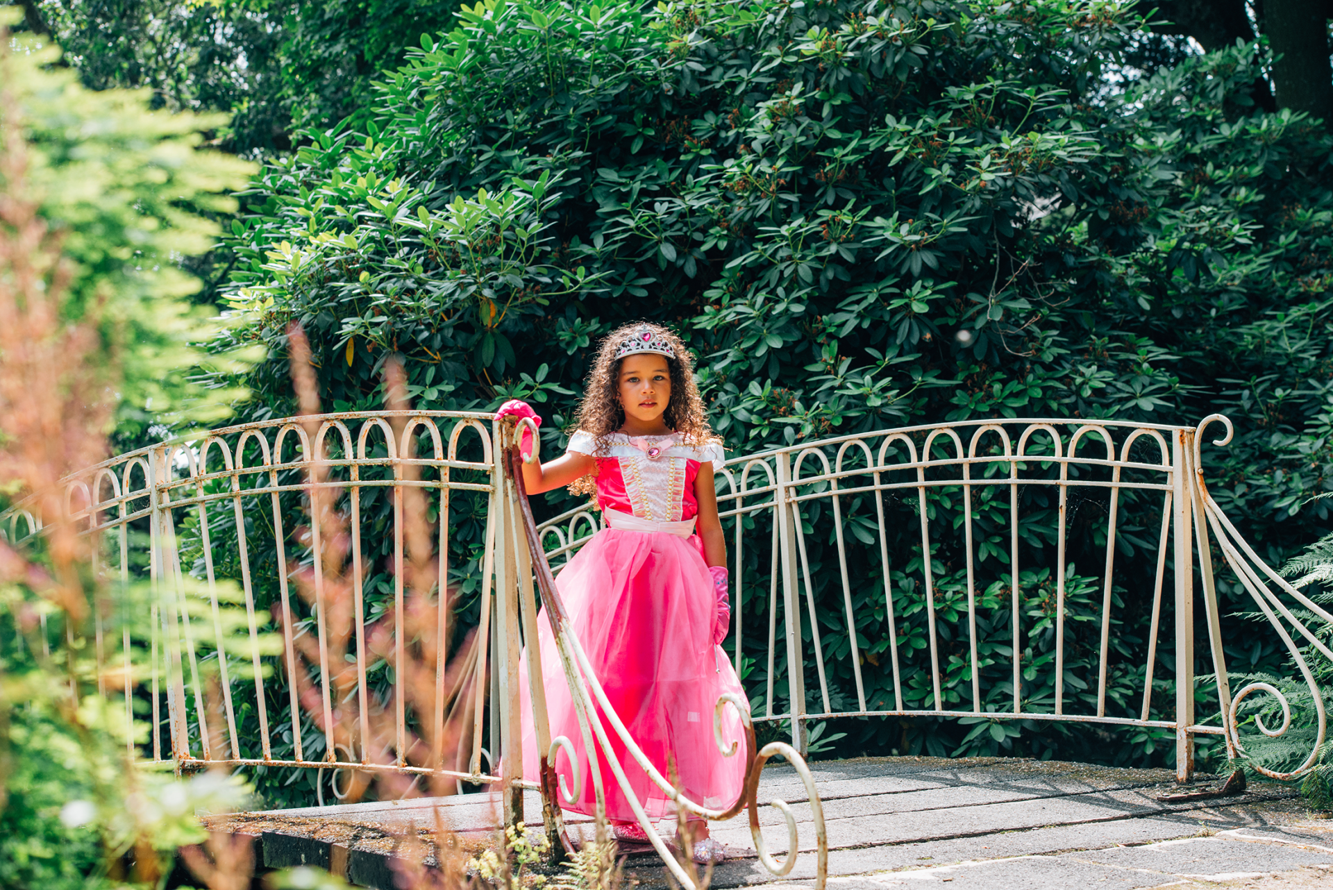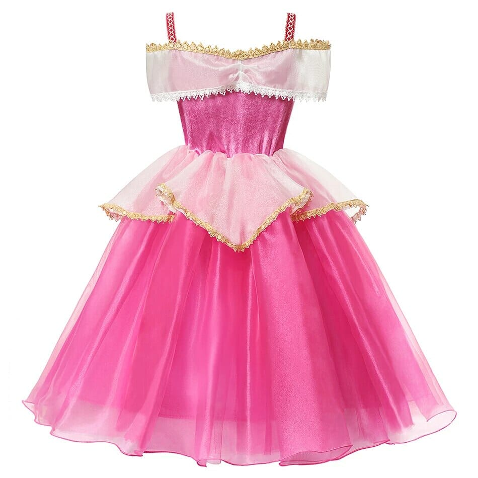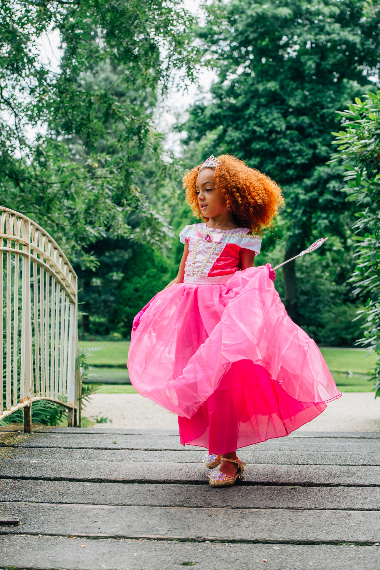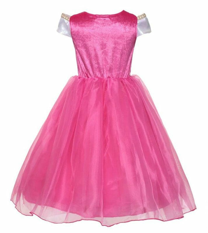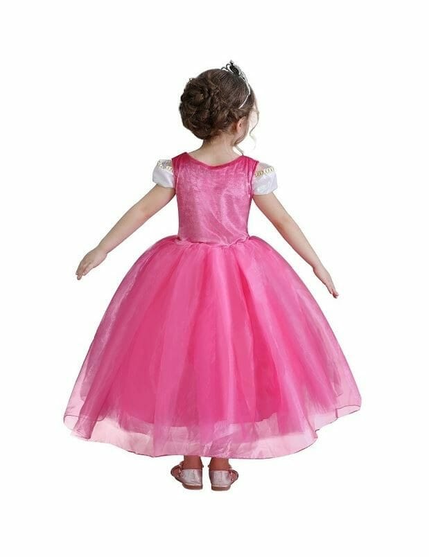 Roze prinsessenjurk geïnspireerd op het bekende Disney verhaal van Doornroosje.