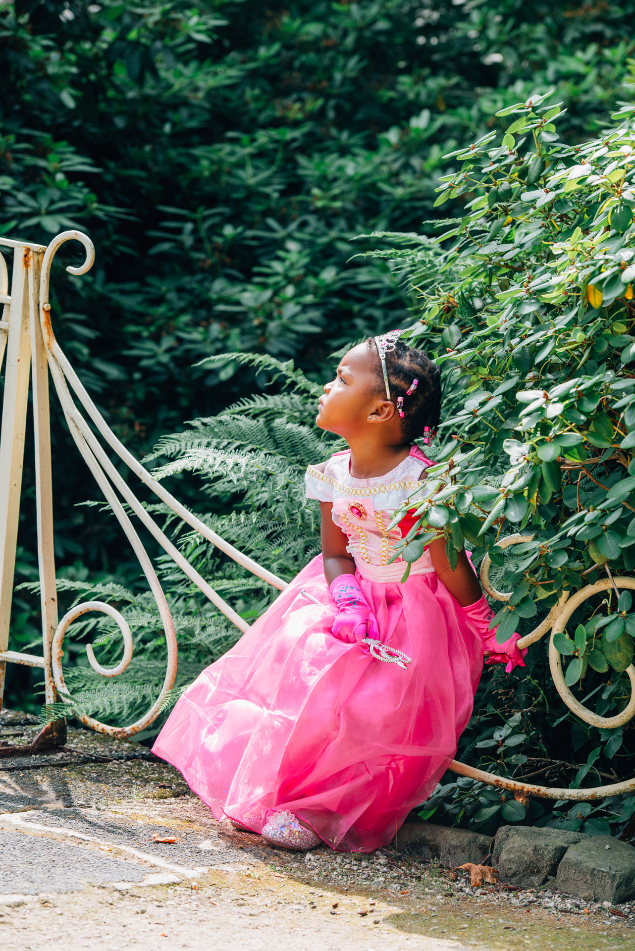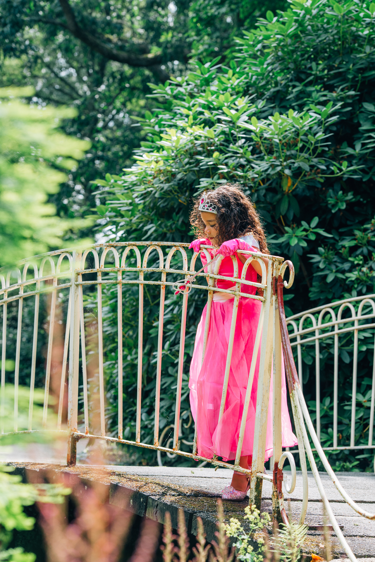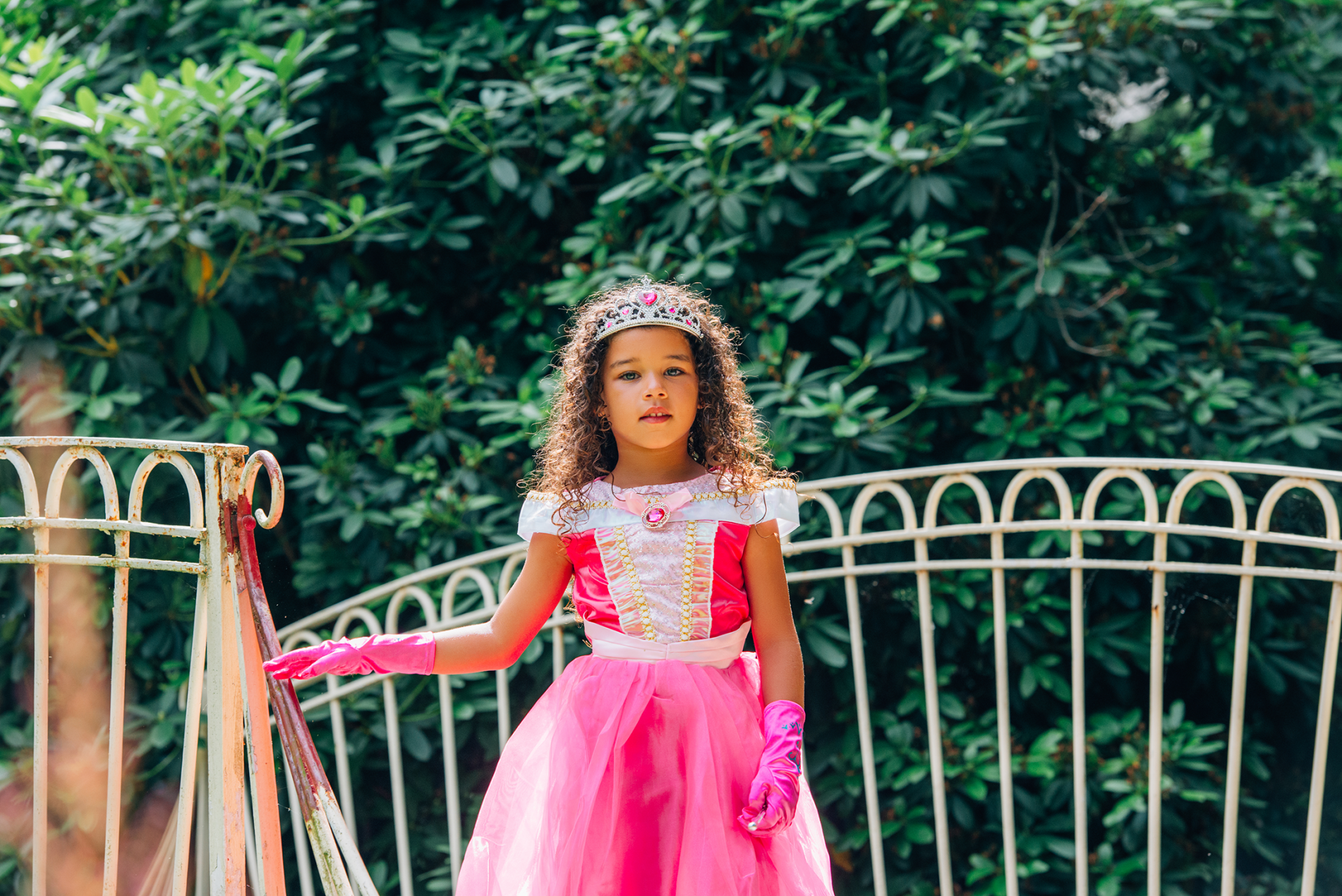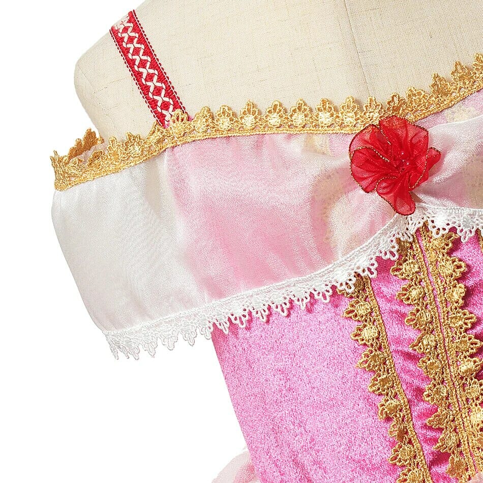 Roze prinsessenjurk geïnspireerd op het bekende Disney verhaal van Doornroosje.