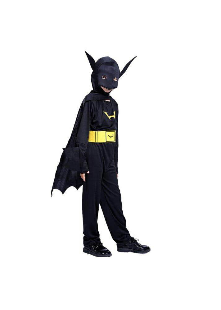 Dit complete Batman verkleedpak bestaat uit een jumpsuit met losse gele band (klittenbandsluiting) cape met masker.
