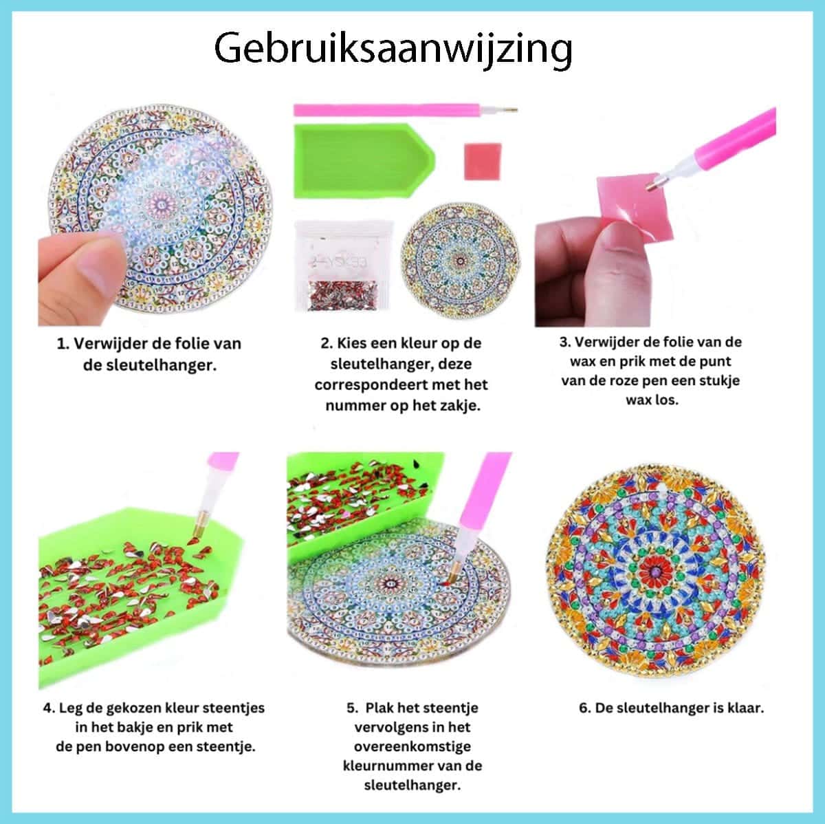 Je ontvangt een volledig pakket met diamond painting (kristallen) steentjes, wax, bakje, hangers en een diamond painting-pen.