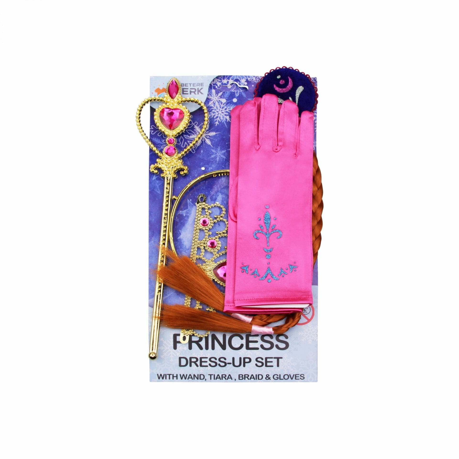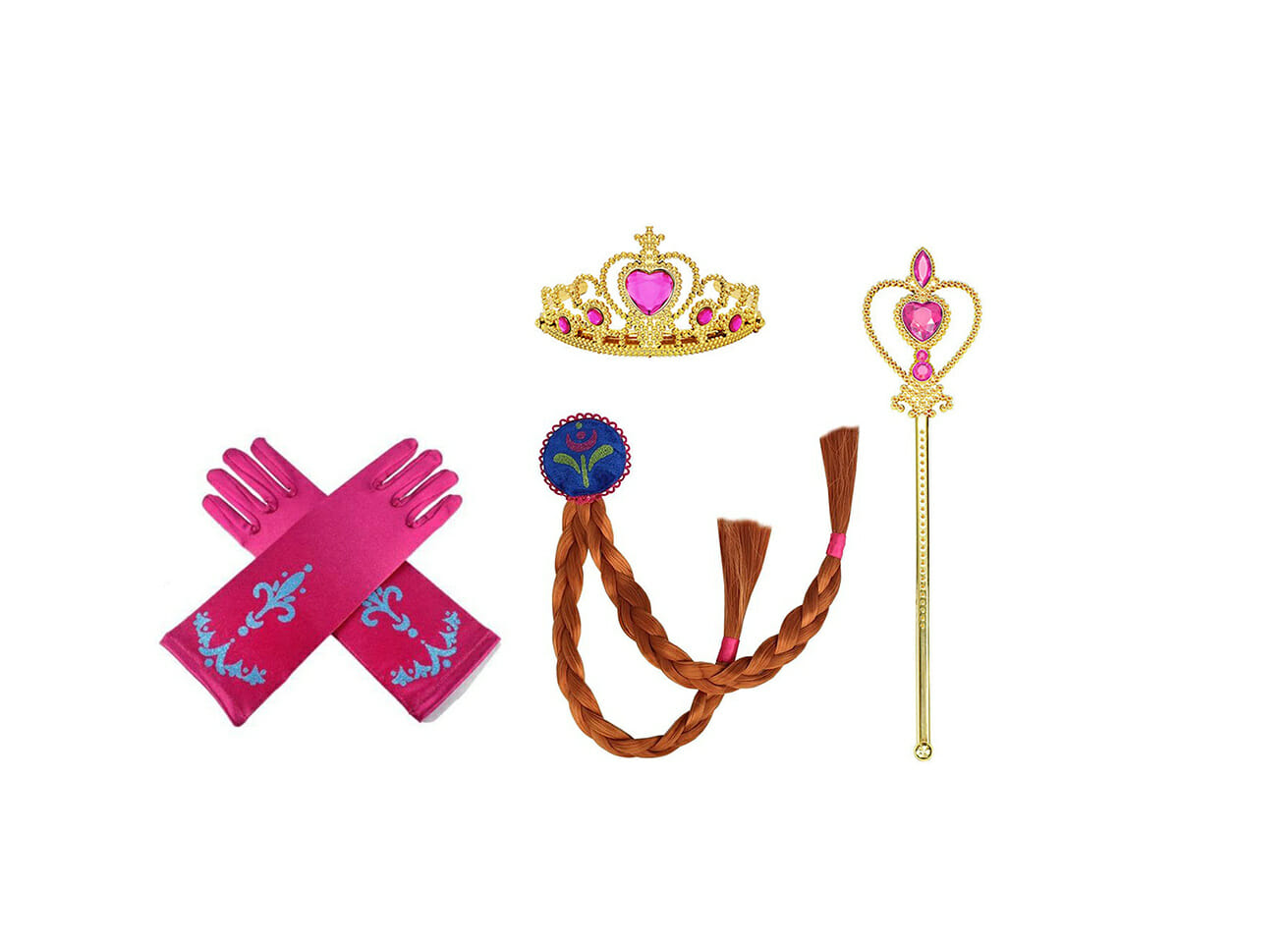 Mooie accessoireset voor bij je prinsessen verkleedkleding deze Tiara, Toverstaf, Handschoenen en Anna vlechtjes.