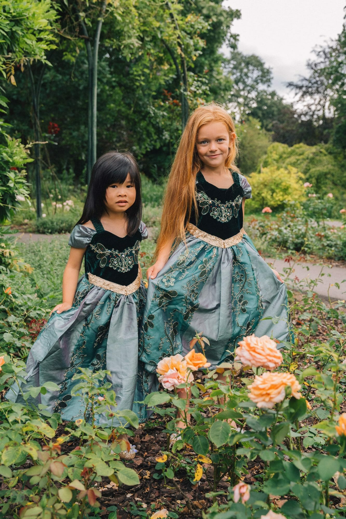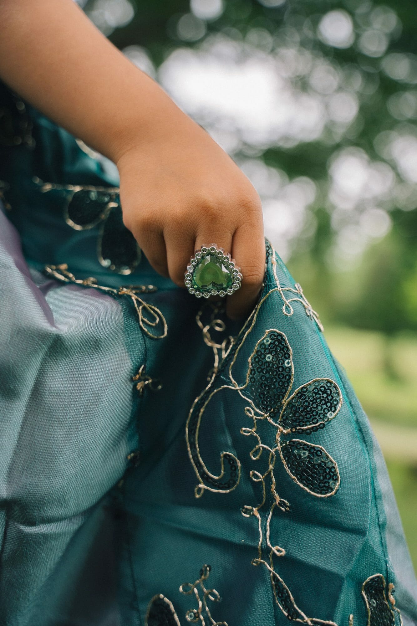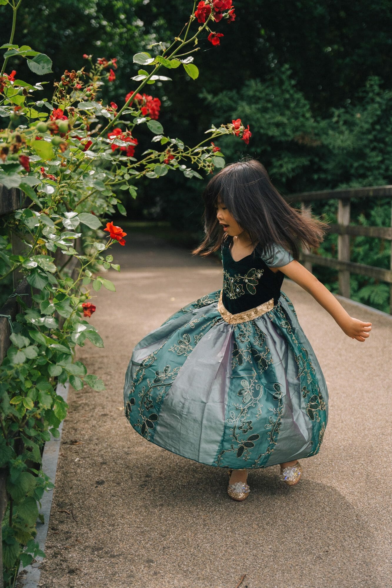 De combinatie van de groene kleur, de goudkleurige bloemen en de glanzende stof maakt deze mooie prinsessenjurk een opvallende en betoverende keuze.