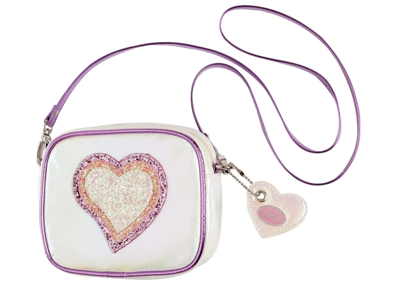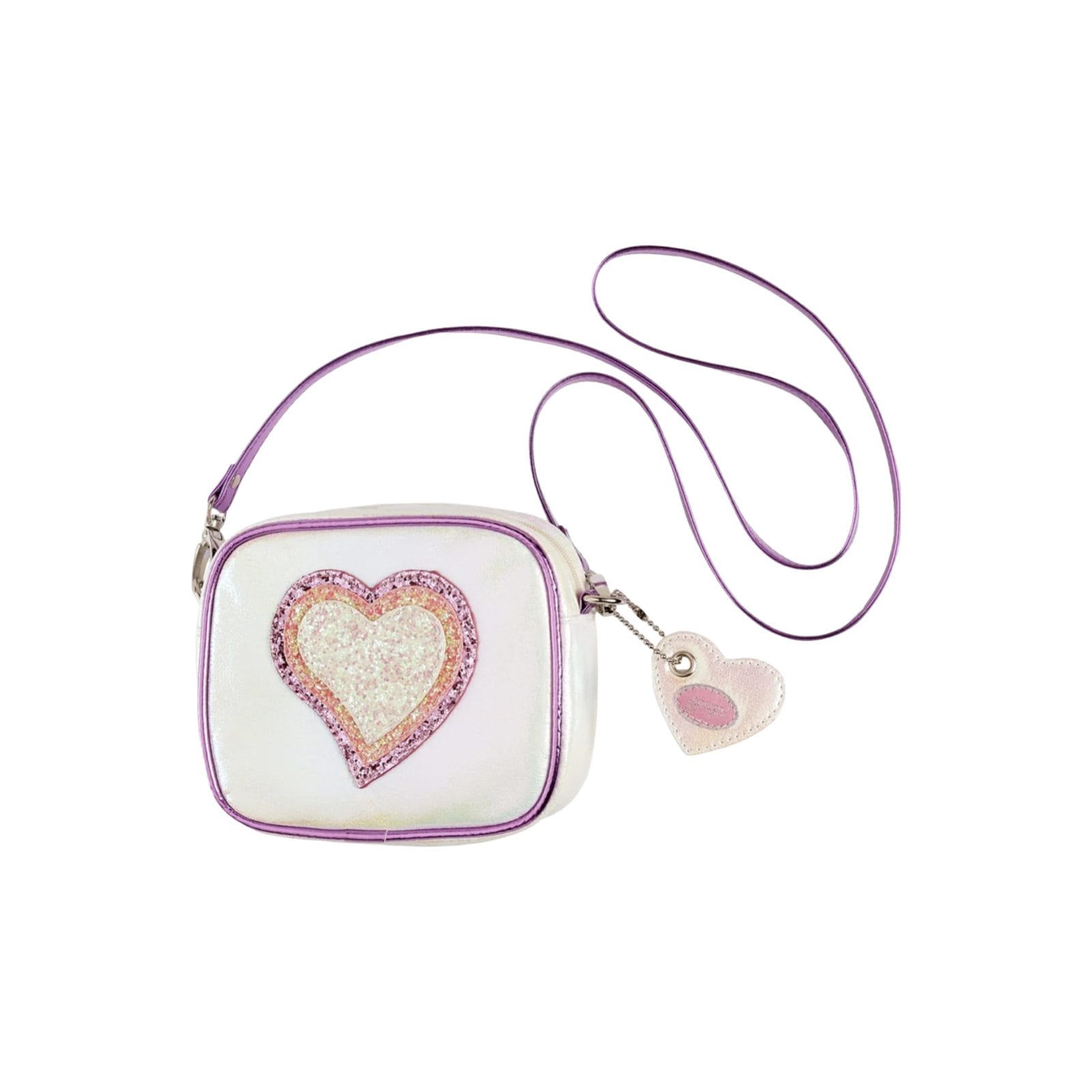 Deze glanzend witte schoudertas met hartvormige applicatie is voorzien van een ritssluiting en een lange schouderriem.