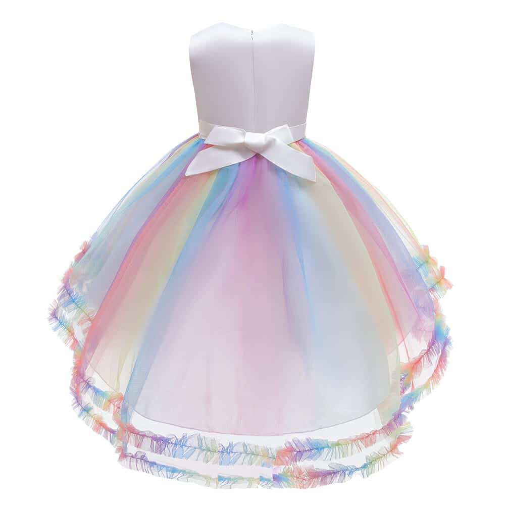 Onze Unicorn prinsessenjurk bestaat uit een wit bovenstuk met op de borst enkele gekleurde bloemetjes versierd met pareltjes.