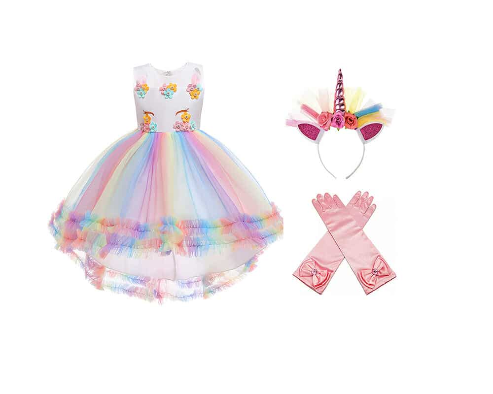 Bij deze Unicorn prinsessenjurk, krijg je ook nog een Unicorn haarband en 1 paar lange roze prinsessenhandschoenen.