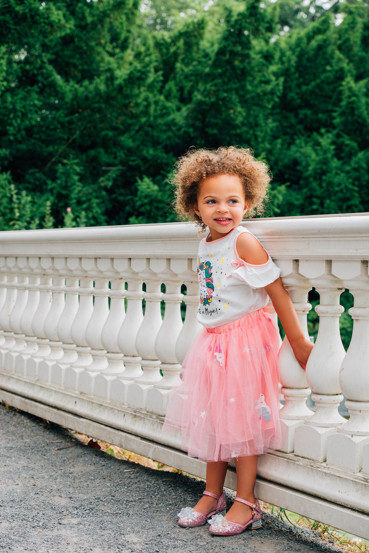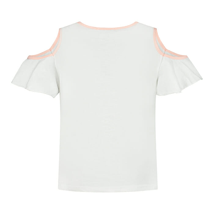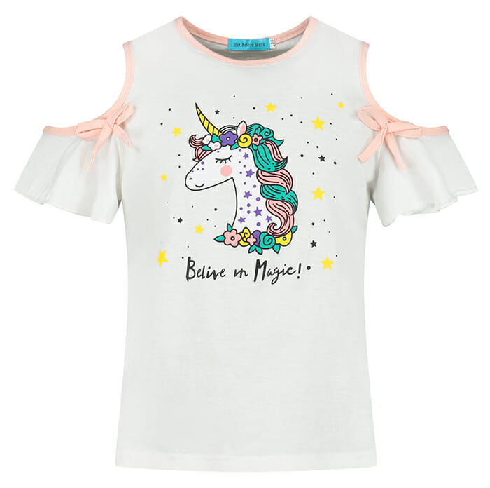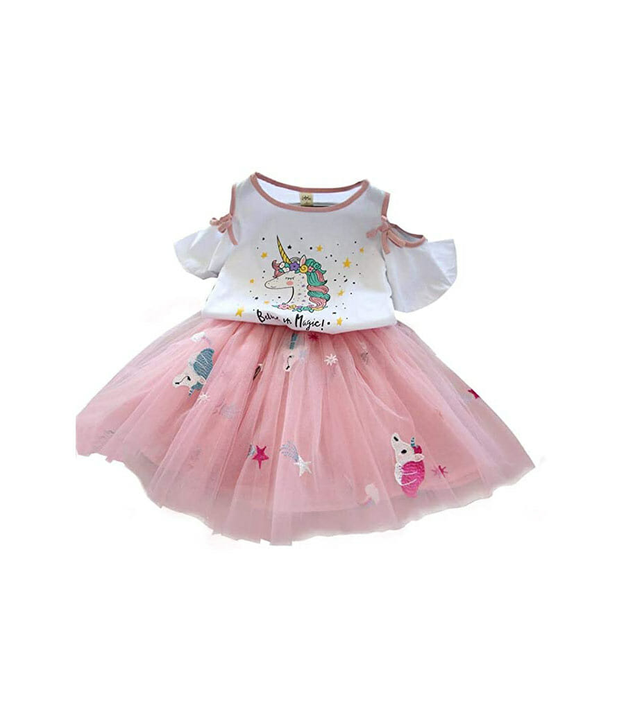 Unicorn kledingset bestaande uit een wit off-shoulder Unicorn shirt met bijpassende roze tutu rok.