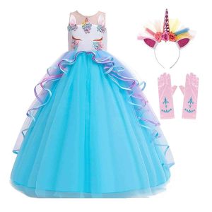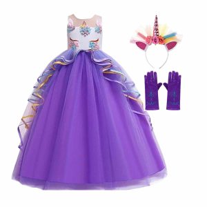 Unicorn Jurk – Eenhoorn Jurk – Paars – Haarband + Handschoenen