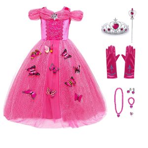 Doornroosje – roze prinsessenjurk vlinders + Kroon + Toverstaf + Handschoenen